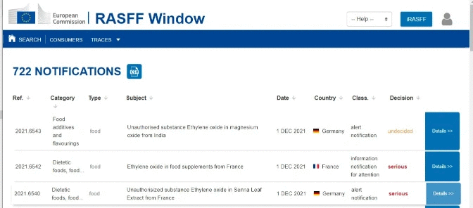 Asociația Pro Consumatori (APC) – Vocea consumatorilor din România, organizație de utilitate publică, statut obținut prin H.G. nr. 1106/2005, organizație cu activitate neîntreruptă de peste 31 de ani în domeniul apărării drepturilor și intereselor economice ale consumatorilor (www.apc-romania.ro), membru în Organizația Europeană a Consumatorilor din anul 2005, singura organizație de consumatori din România calificată să introducă acțiuni în justiție în baza Directivei nr. 1828/2020 privind acțiunile în reprezentare pentru protecția intereselor colective ale consumatorilor (https://ec.europa.eu/info/sites/default/files/romania_country_fich_en_2.pdf), a identificat 722 de notificări de alertă ale țărilor din Uniunea Europeană pentru oxidul de etilenă în urma interogării Sistemului european de alertă rapidă pentru alimente și furaje – RASFF, pentru perioada 9 septembrie 2020 - 1 decembrie 2021.